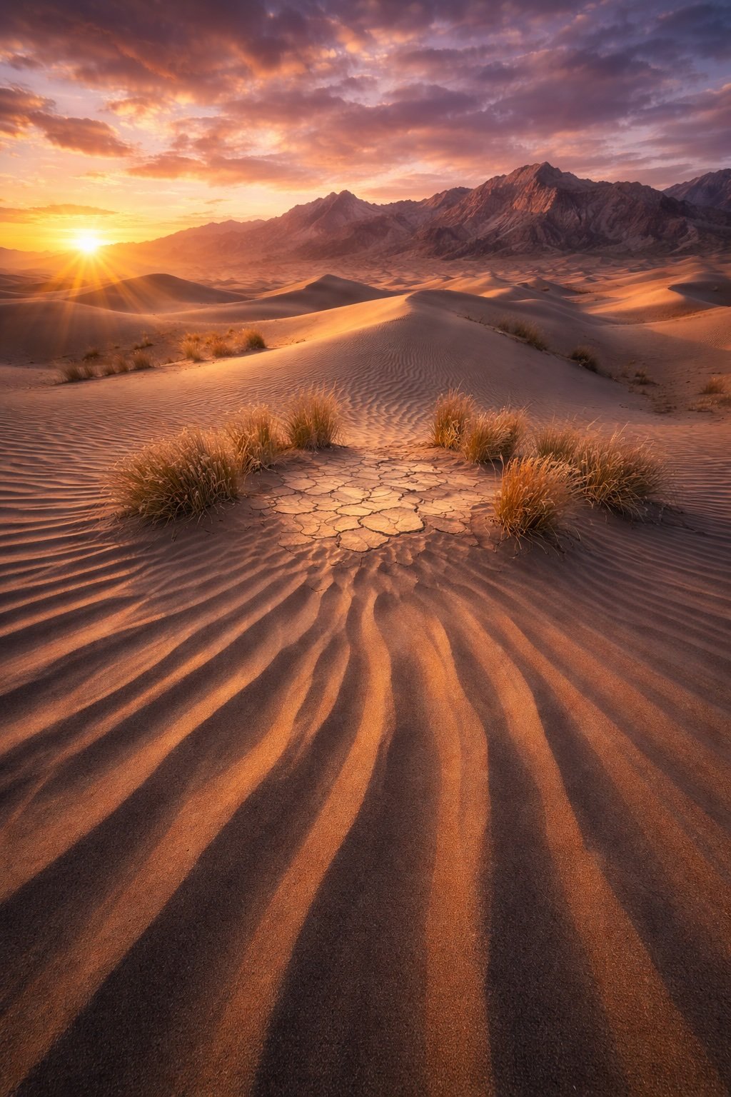 In this pattern, multiple forms converge on a central point—perhaps branches, ridges, or lines in the sand—drawing attention to the heart of the scene.