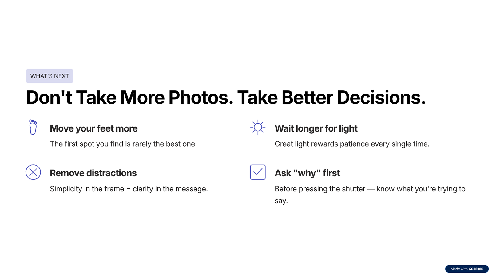 - Ask “why” before pressing the shutter